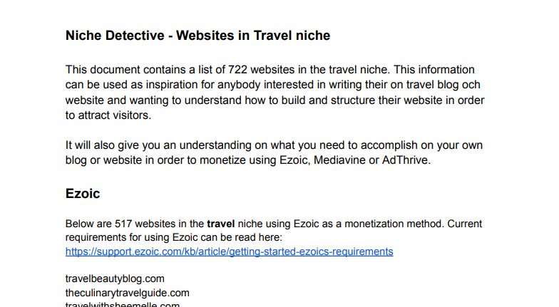 This document contains a list of 722 websites in the travel niche. This information can be used as inspiration for anybody interested in writing their on travel blog och website and wanting to understand how to build and structure their website in order to attract visitors.